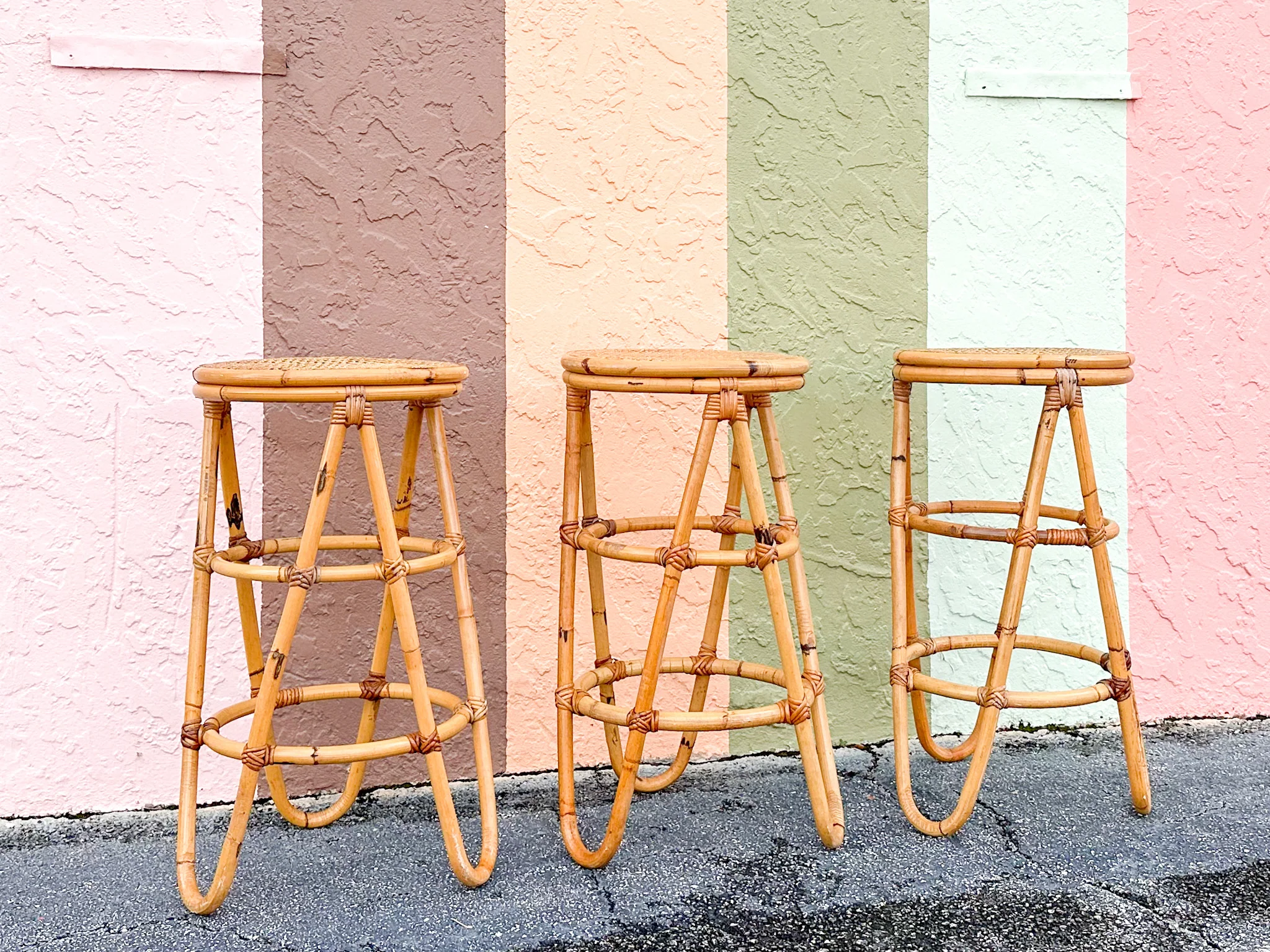 Set of Three Old Florida Cane and Rattan Bar Stools—