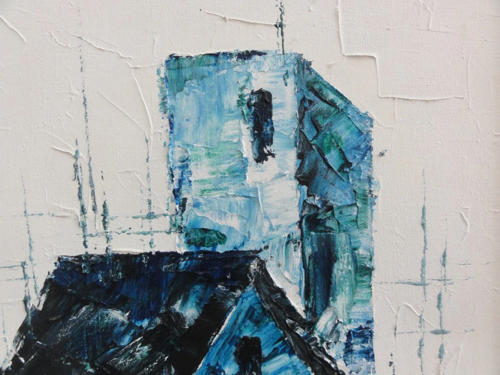 Description: Signed Mid Century Blue House Painting in nice as found VINTAGE condition (see photos)